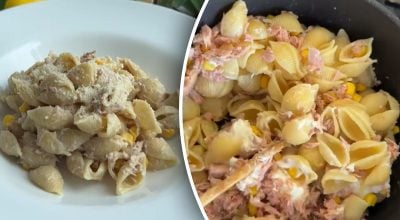 För en snabb middag måste du börja med att koka pastan i saltat vatten. När de är klara lägger du i en sked färskost, en burk tonfisk i sin egen juice och majs efter smak.